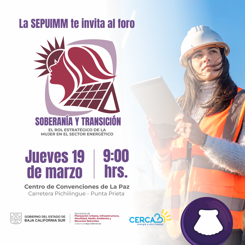 El Gobierno del Estado, a través de la Secretaría de Planeación Urbana, Infraestructura, Movilidad, Medio Ambiente y Recursos Naturales (SEPUIMM), invita a la ciudadanía al foro “Soberanía y Transición”, que se realizará el jueves 19 de marzo a las 9:00 horas en el Centro de Convenciones de La Paz, espacio que busca consolidarse como un punto de encuentro para el diálogo y el intercambio de ideas en torno al sector energético.